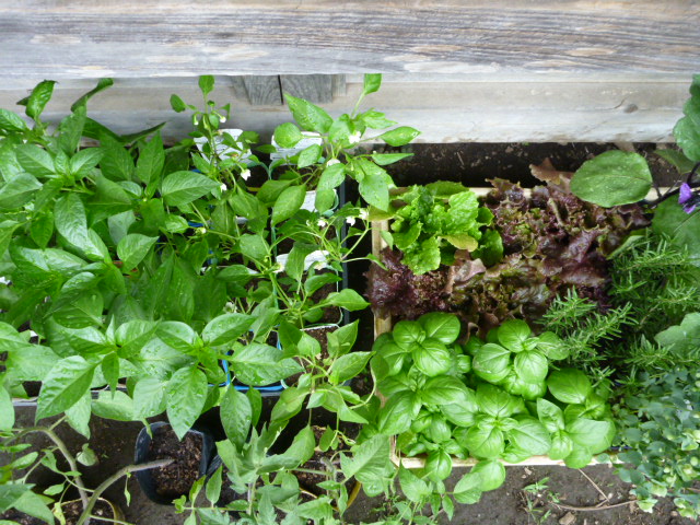 写真はトマト、なす、バジル、ピーマン、サニーレタス、オレガノ、ローズマリー