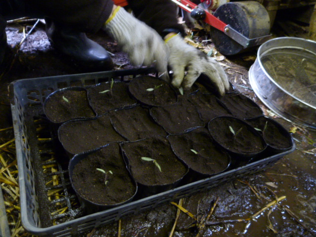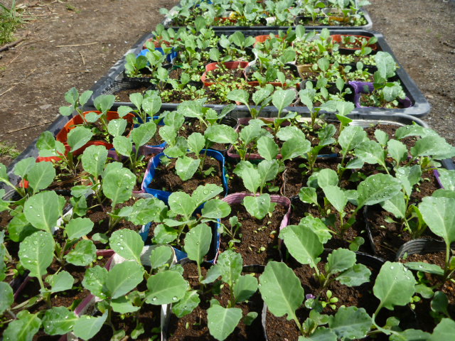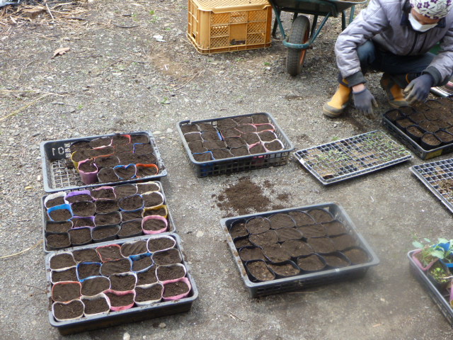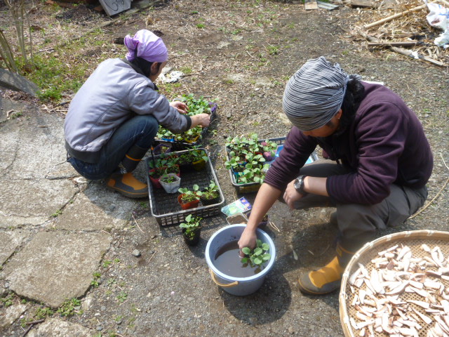 今日はキャベツの苗の畑への定植です。水にポットごと浸して根付きを良くします。